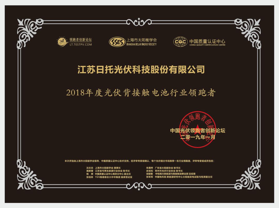 日托光伏是光伏领域技术创新的先行者和坚持者,自2012年起就进行差异化组件技术的研发,开发出具有完全自主知识产权的新一代高效MWT背接触电池和组件技术,极大推动了光伏产品和技术升级,丰富了下游市场应用,加快了中国光伏产业向平价模式发展。2018年,日托光伏推出全新一代“标杆+”系列高效背接触组件,采用“MWT+PERC”技术,60片多晶高效背接触组件转换效率最高可达19.7%,综合功率最高可达320W;60片单晶高效背接触组件转换效率最高可达20.6%,综合功率最高可达335W,成为推动光伏产业发展的有力保障。目前,日托光伏高效背接触电池及组件产能分别已达1.4GW,形成完整的高效背接触组件产业集群。